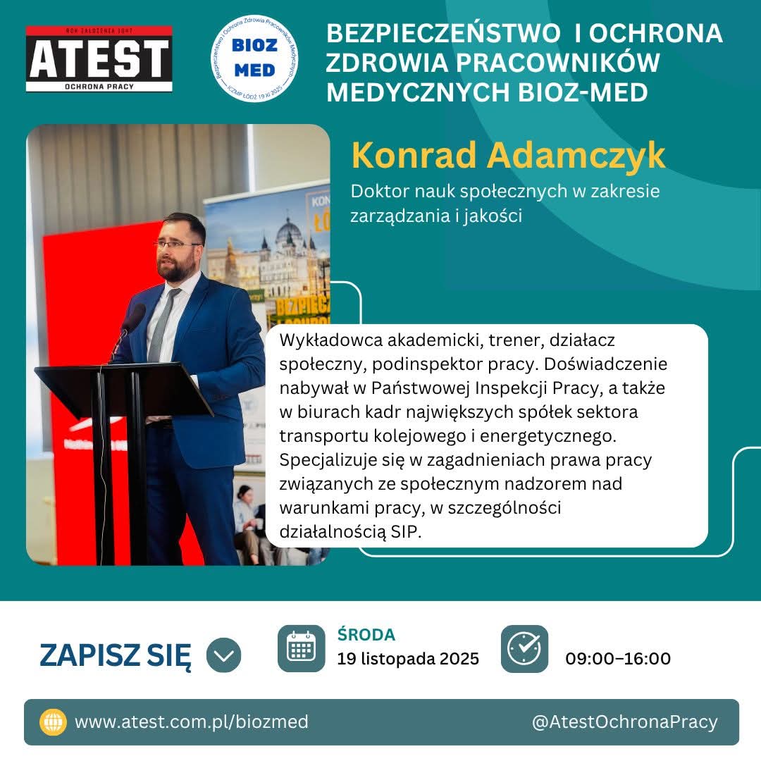 Zapraszamy społęcznych inspektorów pracy, w szczególności ze szpitali i placówek medycznych do udziału w Konferencji Bezpiecześńtwo i Ochrona Zdrowia Pracowników Medycznych. Organizatorem konferencji miesięcznik ATEST – ochrona pracy, Partnerem wydarzenia jest Fundacja Akademia Społecznej Inspekcji Pracy. Wydarzenie odbędzie się 19 listopada 2025 r. w Centrum Zdrowia Matki Polki w Łodzi