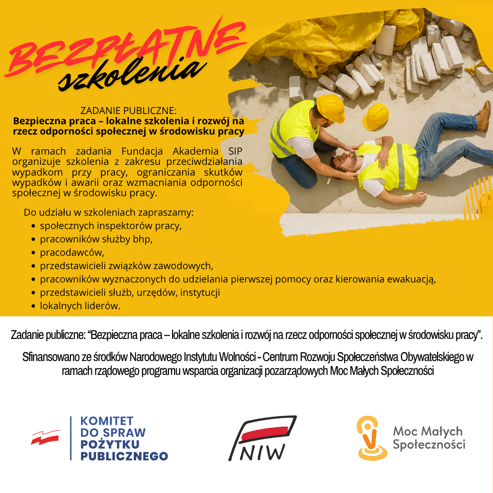 W ramach zadania Fundacja Akademia SIP zorganizowała szkolenia z zakresu przeciwdziałania wypadkom przy pracy, ograniczania skutków wypadków i awarii oraz wzmacniania odporności społecznej w środowisku pracy.
